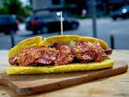 Hot Dog Falafelbułka maślana, domowy falafel, papryka czerwona, pikle, cebula czerwona, salsa z pomidora, ogórka i czerwonej cebuli, sałata, sos Aioli
